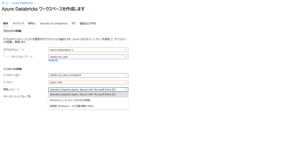 その後、リソースグループやワークスペースを選択していきますが、途中でStarndard / Premiumを選ぶドロップダウンがあります。