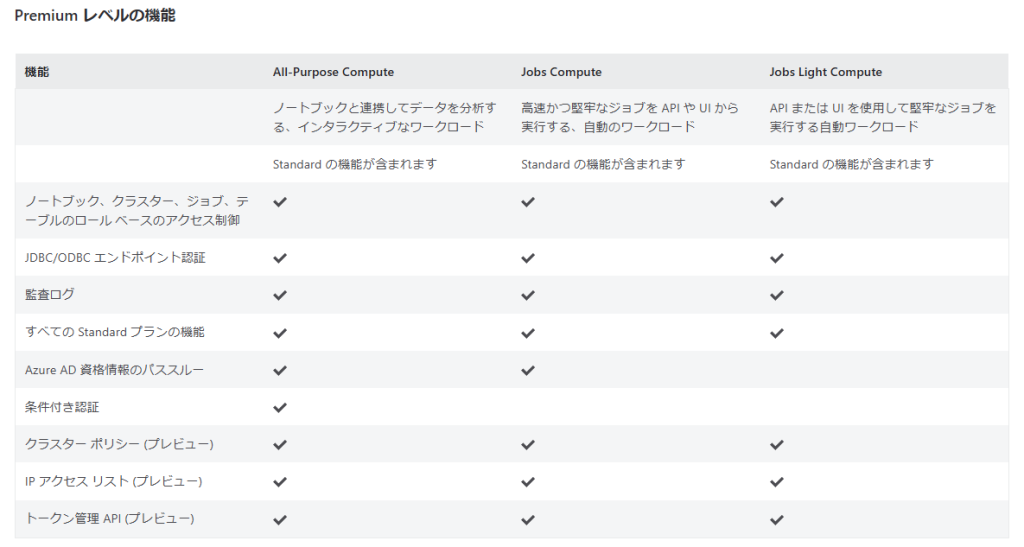 また、今回はAll-Purposeについて見ていますが、他のComputeも使うことができます。Compute毎には下記のような特徴があります。