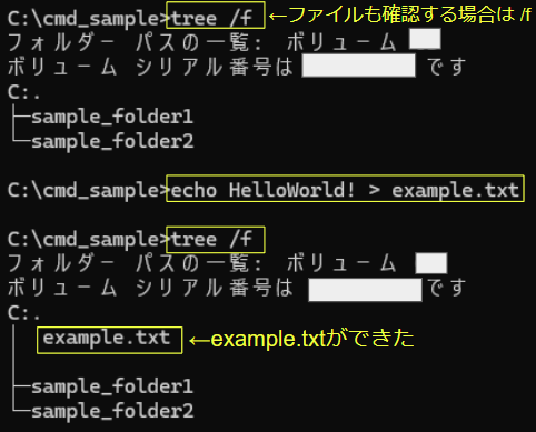 「tree /f」と打ち、今あるファイル/フォルダを確認した後、「echo」にてファイルを作成しました。