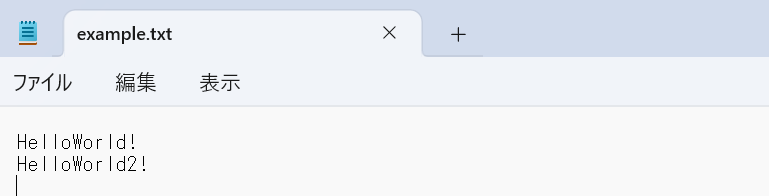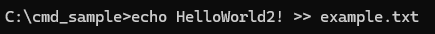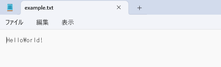 “HelloWorld!”というテキストを含むexample.txtファイルを作成する例になります。ファイルがない場合も、下記のコマンドで新しく作ることができます。