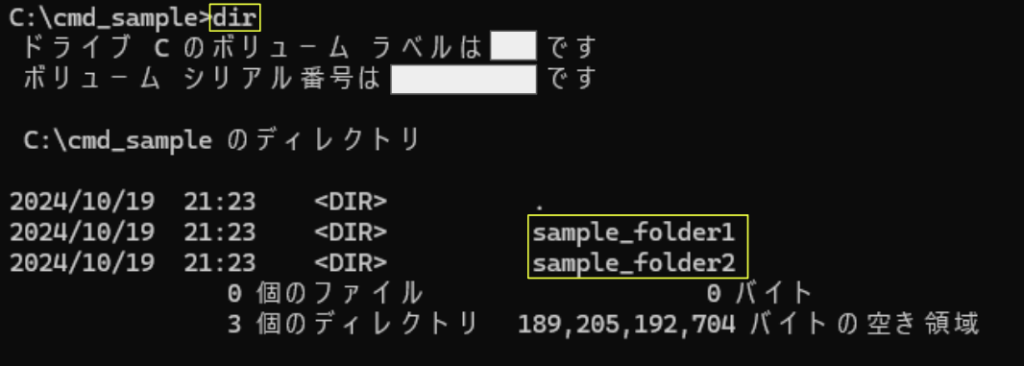 このようにすることで、cmd_sampleの下でコマンドプロンプトの作業をすることができます。