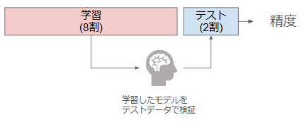 一般的に、下記のように学習データを8割、テストデータを2割として、テストデータを用いて精度を算出し検証します。