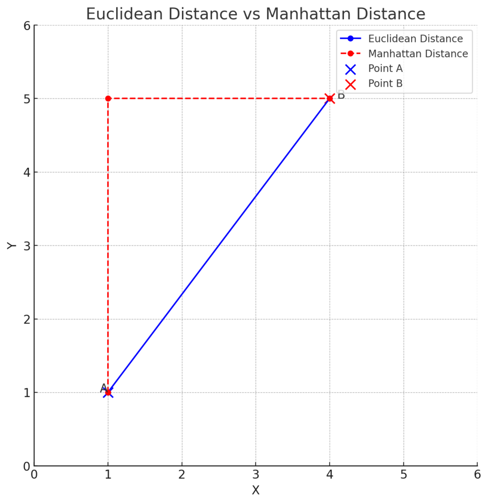 ユークリッド距離とマンハッタン距離は、共に距離を測定する方法ですが、異なる特性を持っています。次の図は、点A(1, 1)と点B(4, 5)の間のユークリッド距離とマンハッタン距離を示しています。