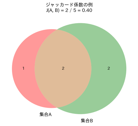 ここで、\( |A∩B| \)は\( A \)と\( B \)の共通要素の数を表し、\( |A∪B| \)は\( A \)と\( B \)の合計要素数を表します。