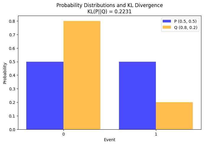 例えば、2つの異なる確率分布を考えます。一方が均等に0.5ずつ割り当てられた二項分布\( P(x) \)(コインの裏表が同じ確率で出る場合)、もう一方が0.8と0.2の確率で割り当てられた二項分布\( Q(x) \)(裏が80%、表が20%の偏ったコインの場合)です。