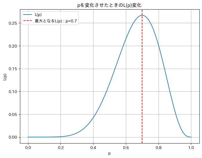 実際にこのL(p)について、pを変化させていったとき、L(p)が最大となるところを見てみます。
