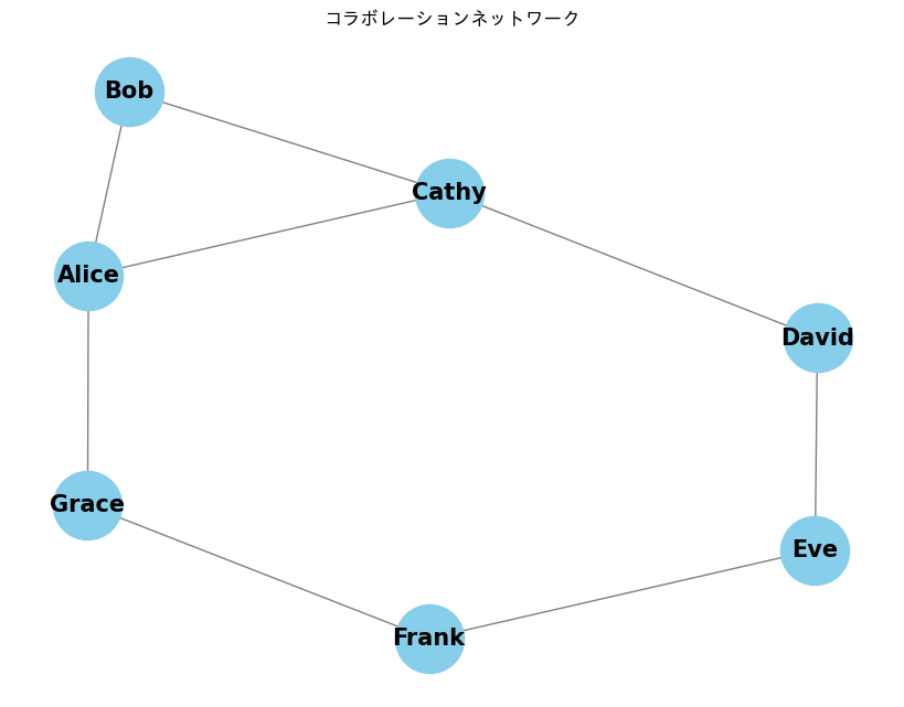 以下に、Pythonを使った簡単なネットワーク分析のコード例を示します。この例では、データが著者同士が共同で論文を執筆した関係を示すもので、NetworkXというライブラリを用いてネットワークを分析します。