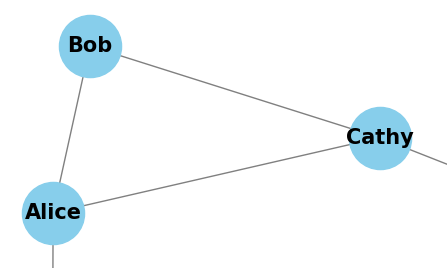 下記画像は後で出てくる結果の一つですが、「Bob」「Alice」「Cathy」がノード(点)で、それをつないでいる線がエッジ(線)となります。