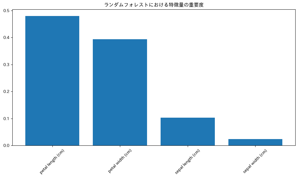 plt.title('ランダムフォレストにおける特徴量の重要度')