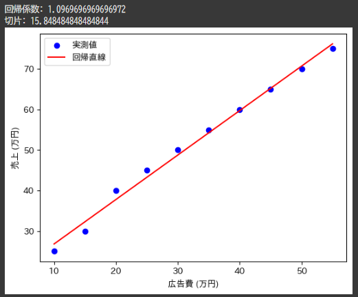 この算出結果は、広告費が1万円増えるごとに売上が1.096万円増加することを意味します。