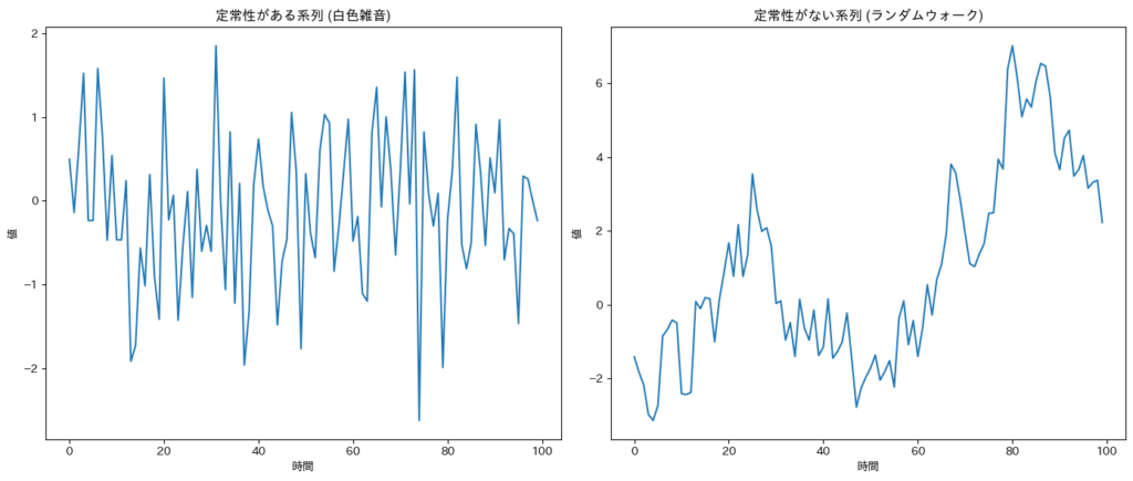 具体的には左図が定常性の時系列で、右図が非定常の時系列となります。定常の時系列は時間によって平均やばらつきが変化しませんが、非定常の場合は時間に従い変化していきます。