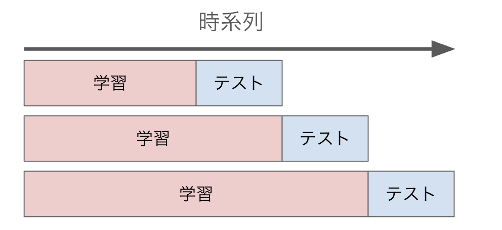 注意点となりますが、分割時はトレーニングデータには古いデータを用いて、テストデータには新しいデータを使う必要があるので注意が必要です。