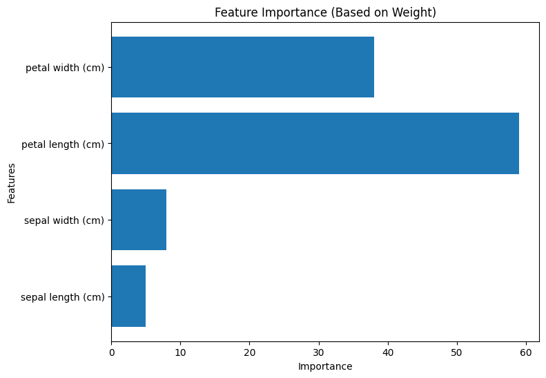 Weightに基づく重要度は、各特徴量が分割に使用された回数(ウェイト)に基づいて算出されます。すなわち、各特徴量がモデルにおいてどれだけの頻度で重要な役割を果たしたかを示します。Weightに基づく重要度は、モデルがどの特徴量に焦点を当てて学習したかを表します。